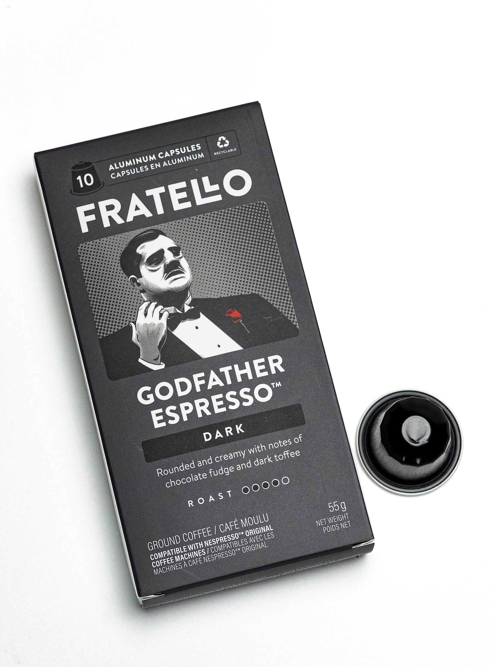 Introducing Godfather Dark, the darkest roast in our Godfather lineup—now in convenient, 100% recyclable aluminum capsules, compatible with Nespresso® Original Line machines. Expect intense dark chocolate notes, heavy body, and a lingering smoky finish that’s both powerful and smooth.