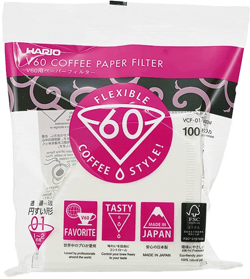 100 pack of the white bleached V60-01 paper Hario filters. Gives you a sediment free clean cup of coffee. As with any paper filter, ensure that you wash through with boiling water first to remove any remaining paper taste.