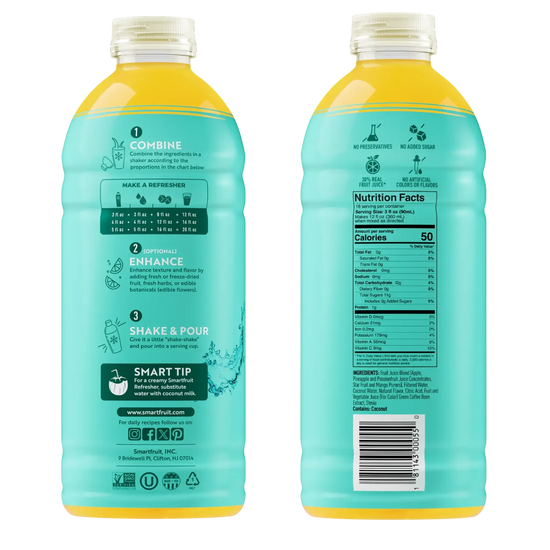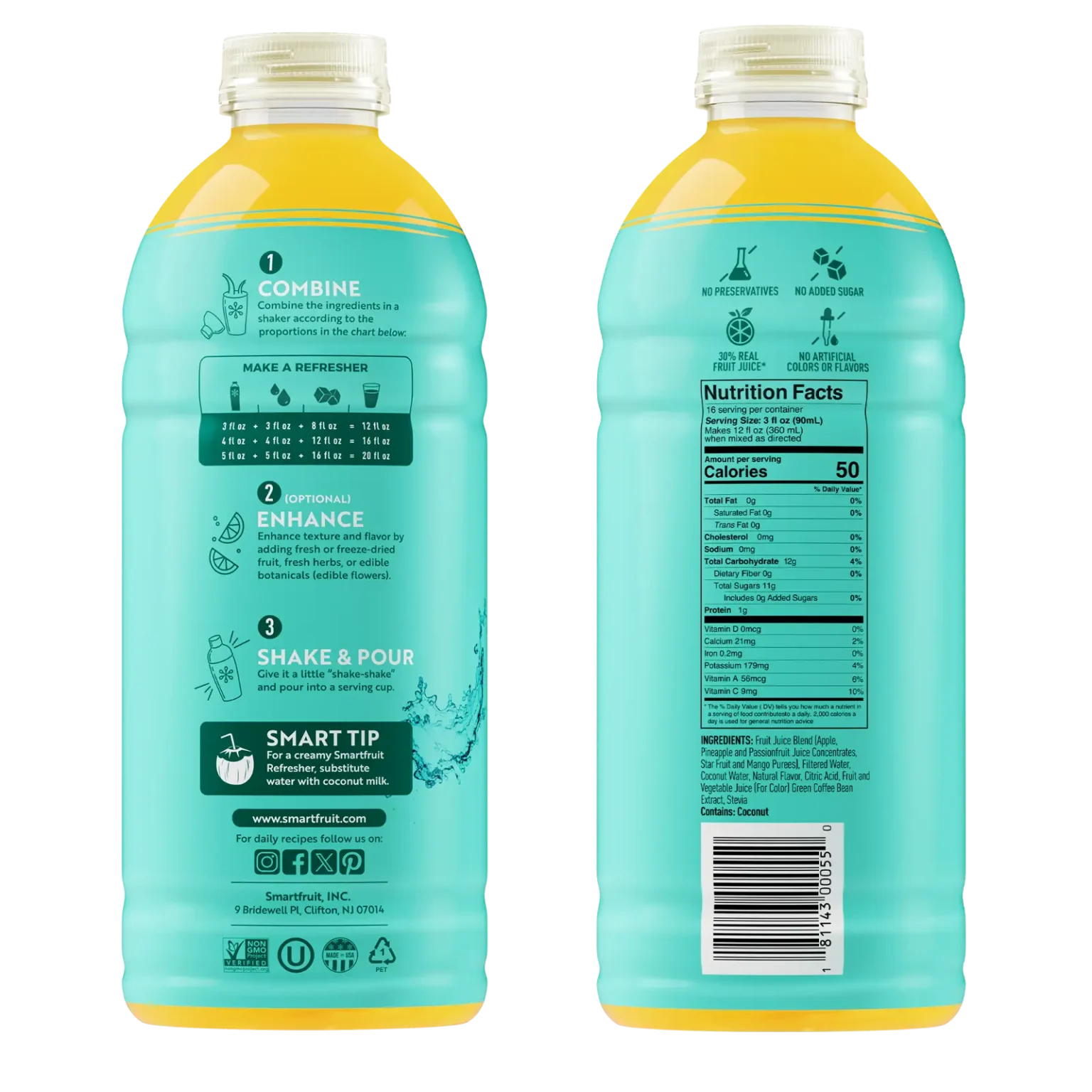 The seamless interplay of flavors from these tropical fruits transforms Refresher Revive from a beverage into an experience. The rich and aromatic flavor from mango combined with the sweet and slightly tart flavour of passion fruit complement each other perfectly. Lastly the tropical star fruit adds a unique flavor with a subtle hint of sweet and sour making it truly reviving. Each bottle is infused with hydrating coconut water, rich in electrolytes, essential vitamins, and minerals. We’ve also added green coffee bean extract to give a natural boost of energy and focus without the coffee taste. Sticking to the Smartfruit tradition, there is NO added sugar, and each serving is only 50 Calories so you can shake off the guilt of having more than one cup! Simply add H₂O and ice to your shaker and get ready to serve up the perfect real fruit refresher.